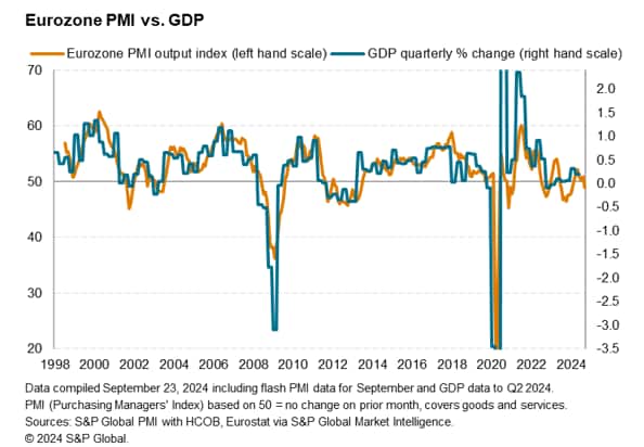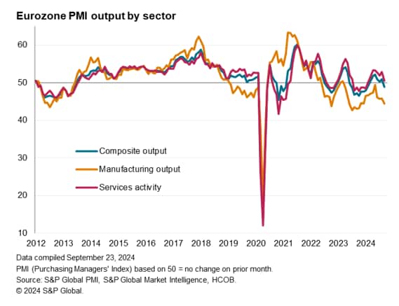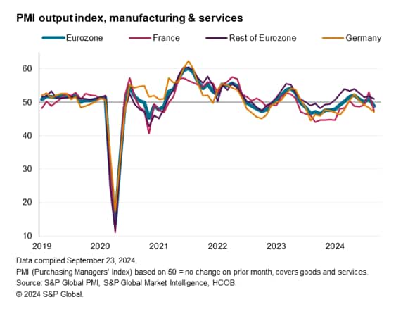 Last month we warned that an improvement in the eurozone PMI looked temporary, in part reflecting a boost to business activity in France surrounding the Paris Olympics. As expected, this impact has waned in September, contributing to a fall in business activity across the region which reflects a broad-based economic weakening.