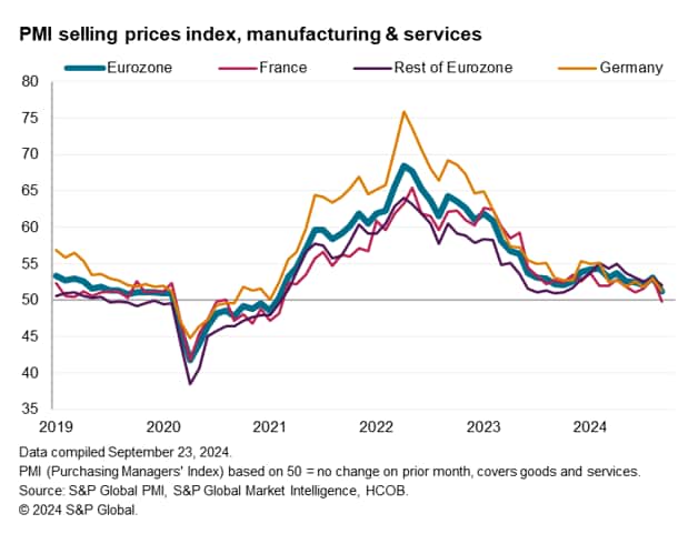 Lower cost growth fed through to reduced upward pressure on selling prices. Average prices charged for goods and services across the eurozone rose only very modestly in September, rising at the slowest rate since February 2021. The decline pushes the PMI's selling price index to a level below that consistent with the ECB's 2% target, according to historical comparisons.