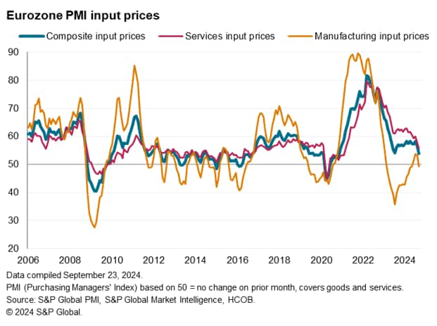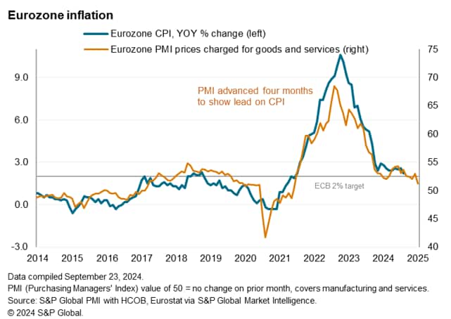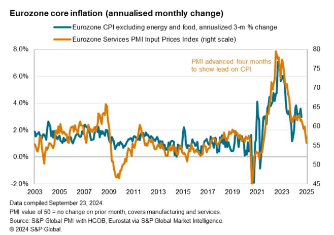 The PMI® survey data for September showed average prices charged for goods and services rising at the slowest rate since February 2021. The survey PMI's selling price index has in fact now fallen to a level below that consistent with the ECB's 2% target. Importantly, services inflation has cooled further, down to its lowest since March 2021. Goods prices are falling.