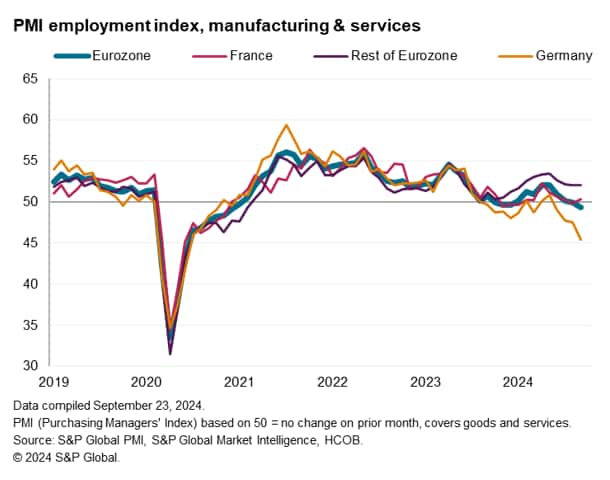 Having surged to a 27-month high of 53.1 in August on the back of a jump in service sector activity, coinciding with the Paris Olympics, the composite PMI for France slumped back to 47.4 to indicate the steepest monthly fall in output since January. However, it was not just France's service sector that deteriorated, as the country's factory output fell at the sharpest rate since January.