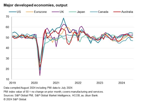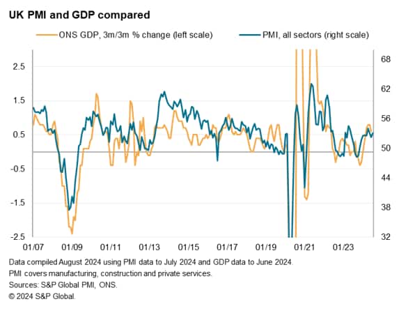 Official data have confirmed recent upbeat survey evidence, indicating that the UK economy is faring well in 2024. Gross domestic product rose 0.6% in the second quarter, according to initial estimates from the Office for National Statistics, building on a solid 0.7% gain in the first three months of the year. This follows robust S&P Global PMI readings for the UK in the year to date. The all-sector PMI index (tracking output in the manufacturing, services and construction sectors) has averaged 52.9 over the first seven months of 2024, having not fallen below 52.3 so far this year.