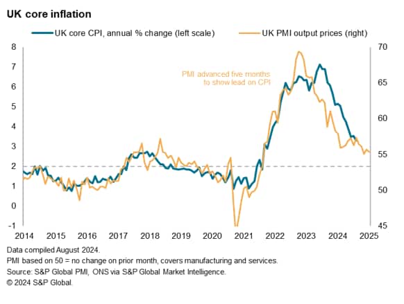 While markets have been increasingly pricing in two more rate cuts by the Bank of England in 2024 since the lower-than-expected CPI reading for July, further downward progress in the PMI price gauges - especially for services - may be needed to convince the majority of policymakers that another cut interest rates is warranted any time soon.