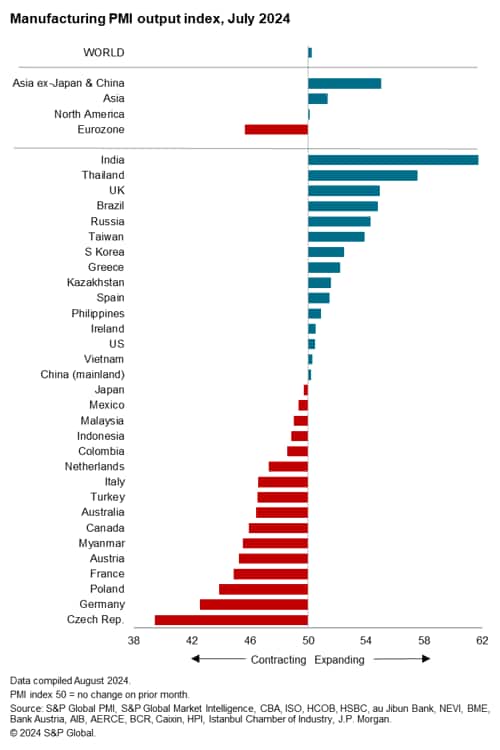 Much of the UK's recent economic strength is due to robust service sector activity growth, which is also propelling growth in the US and Japan. However, worthy of special note is a marked outperformance of manufacturing in the UK in recent months. Only India and Thailand reported faster manufacturing growth than the UK in July, according to S&P Global's PMI surveys. By comparison, factory output fell sharply in the eurozone and declines modestly in Japan, while only a modest increase was recorded in the US.