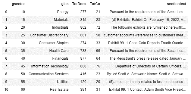 In this short article, we’d like to explore the concept of identifying the sectors which are potentially concerned about inflation the most by using Market Intelligence’s Machine Readable Filings (LINK to Marketplace) dataset. We’ll use a very simple Natural Language Processing of doing word count (after properly parsing the words and applying stop words relevant to financial analysis).