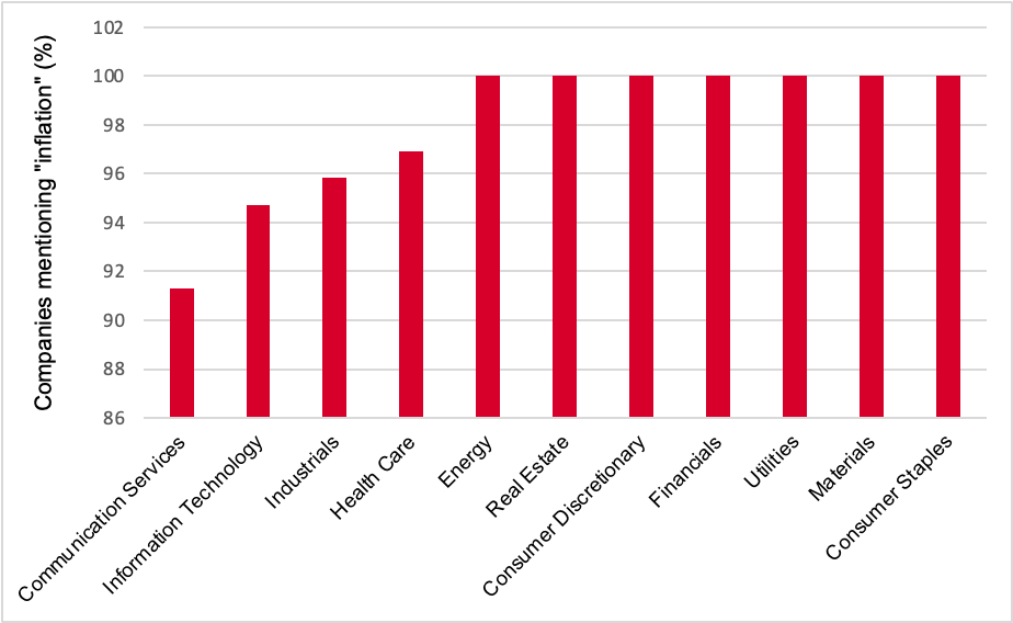 Figure 1: Percentage of Companies Mentioning “Inflation” in 2022 Regulatory Filings (as of 9/1/2022, Source: S&P Global Market Intelligence)