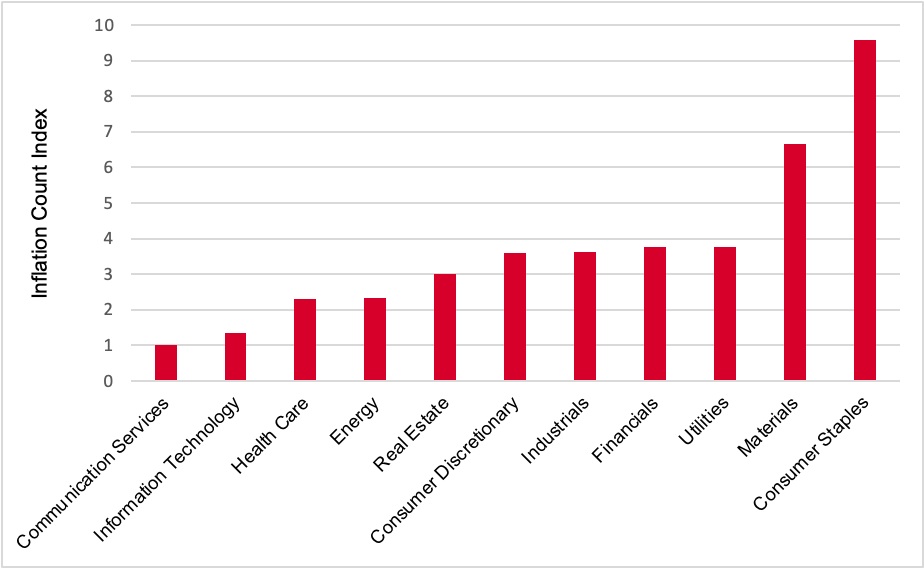 The second highest mention of inflation came from the Materials sector. This sector deals with physical assets and commodities such that their product prices and asset values usually rise with inflation.