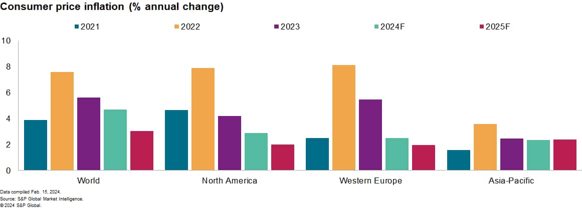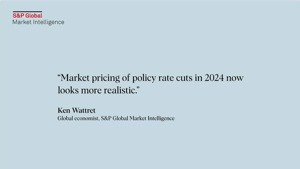 Core inflation rates have continued to fall but the outlook is more uncertain owing to shipping disruptions. While headline global consumer price (CPI) inflation edged up in December 2023, according to our estimates, the core rate declined for the ninth straight month. Global core goods CPI inflation dropped to just 1.3% in December 2023, according to our estimates, 7 percentage points below the early 2022 peak. PMI data has started to show some effects from disruptions to shipping routes, including a lengthening of suppliers' delivery times in January for the first time in a year. Still, manufacturing price indices remained relatively stable, and the Material Price Index (MPI) compiled by Market Intelligence saw a sharp fall in mid-February, with weakness broad-based. Consistent with various related indicators and rules of thumb, the inflationary effects of the shipping disruptions do not appear to be large enough to materially alter the outlook. We will continue to monitor the upside risks. Global CPI inflation for services remains relatively sticky, edging down to 4.6% in December 2023, and we continue to expect a gradual moderation.