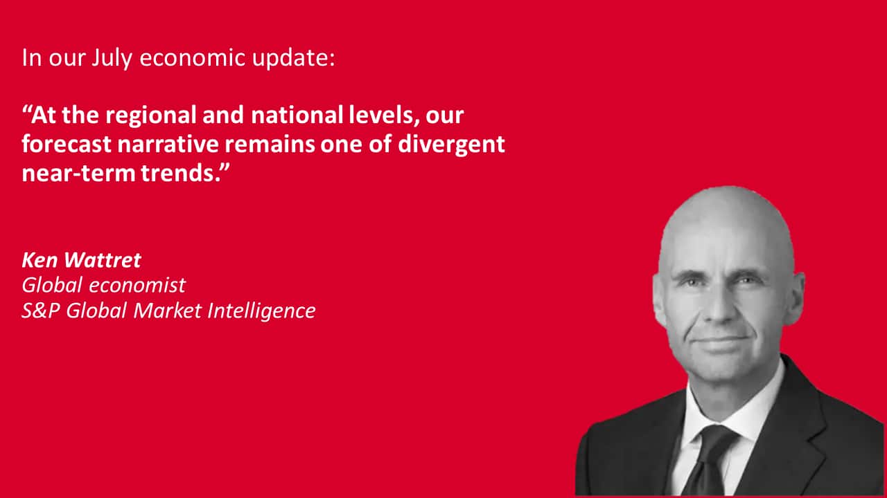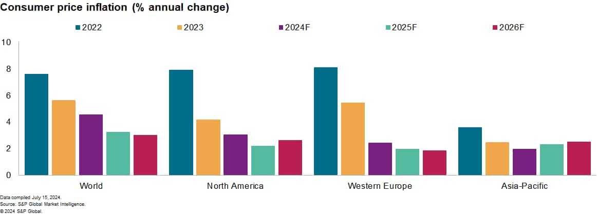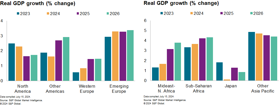 S&P Global Market Intelligence analysts' forecast of global real GDP growth in 2024 is unchanged at 2.7% in July's update. Downward revisions to our growth forecasts for Canada and Japan have been broadly offset by upward revisions to projections for the UK particularly, as well as for India and Russia. The 2025 global growth forecast has been edged down, from 2.8% to 2.7%, primarily reflecting a weaker US forecast.