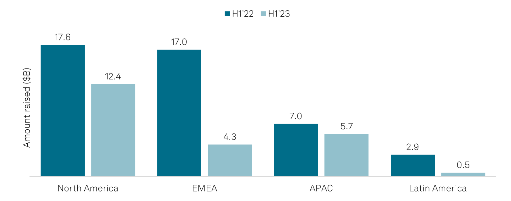 Figure 2: EMEA saw the biggest impact of fintech funding downturn in H1 2023