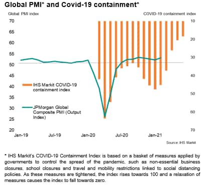 Whereas growth had slowed in the three months to January, primarily reflecting the re-introduction of measures to control further outbreaks of the virus in many countries, February saw restrictions ease on average. IHS Markit's Global COVID-19 Containment Index fell from 48 in January (which had been its highest since last May) to 45 in February.