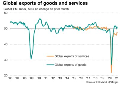 Growth of business activity in the service sector meanwhile lagged behind that of manufacturing again, principally due to an ongoing marked fall in cross-border trade in services (whereas exports of goods continued to rise). Service sector exports continued to be hit by COVID-19 restrictions on travel and tourism in particular.