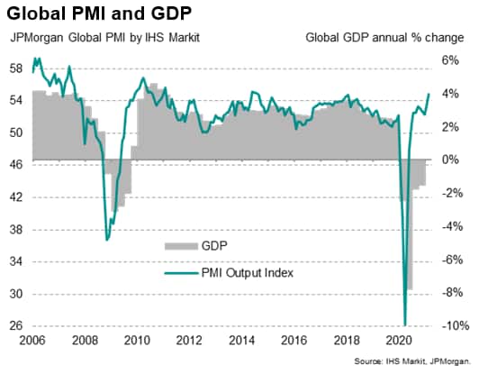All broad sectors of manufacturing meanwhile reported robust expansions, led by the investment goods sector to hint at an encouraging sustained upturn in capital spending. Also noteworthy was an acceleration in consumer goods production to the joint-highest since December 2018, fueled in particular by a surge in demand for consumer goods in the US (in part attributed by many companies to fresh fiscal stimulus).