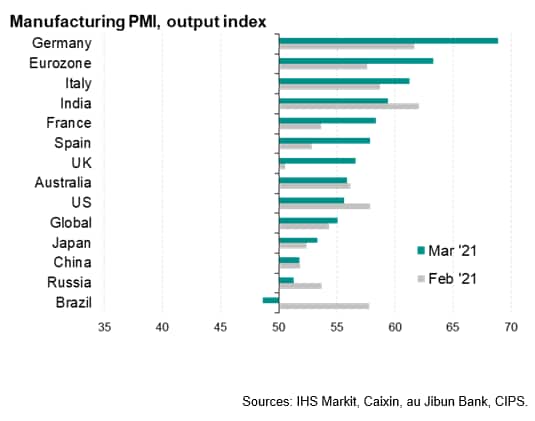 The US continued to lead the global expansion, with growth not only hitting the highest since August 2014 but also running close to an all-time US survey record high. The service sector was the main driver of the US expansion, recording the fastest growth of all major economies surveyed in March, though manufacturing growth slowed mainly as a result of supply bottlenecks (new orders for goods rose at an increased rate).