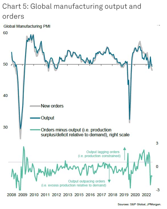 To further understand the near-term trajectory of manufacturing output we first need to assess the health of current demand, and in this respect the latest PMI survey data showed inflows of new orders falling at an increased rate in August. The decline was in fact one of the largest seen over the past decade, albeit far smaller than the drops seen in the initial stages of the pandemic, and - importantly - exceeded the drop in output. This divergence between output and new orders in recent months (see chart 5) suggests that, absent a sudden revival in demand, manufacturers will need to adjust output down further in the coming months in line with the new, weaker, demand environment.