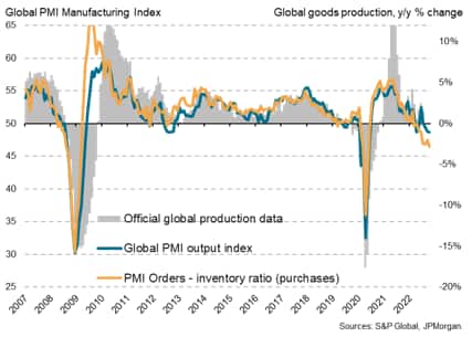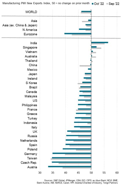 Of the 31 economies for which S&P Global PMI data are available for October, some 21 reported falling production, which was also the case in September. Taiwan and the Czech Republic experienced the steepest downturns and ones that were notably faster than compared to the previous month. This was followed by Poland and Spain, the former continuing to suffer from their proximity to the war in Ukraine and soaring energy costs. The eurozone and UK likewise saw marked downturns on the back of weak demand.