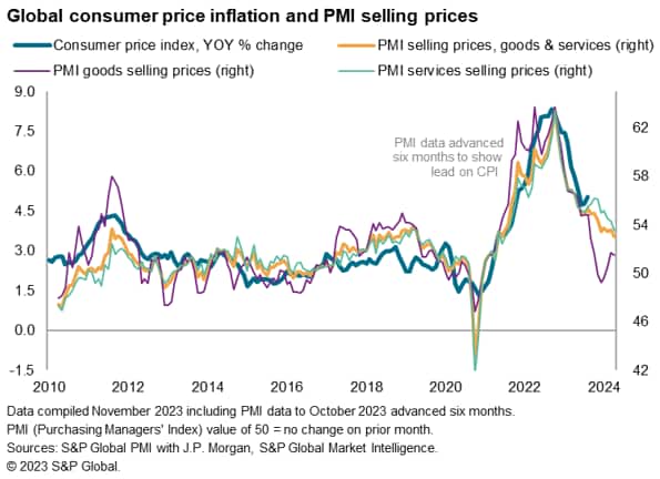 Looking at price trend variations around the world, the steepest decline in inflationary pressures has been seen in the eurozone, where the PMI's selling price index covering goods and services has fallen to its lowest since February 2021 and is now only 1.6 index points above its pre-pandemic long run average. At this level, the PMI index is signaling CPI inflation to fall further from 2.9% in October to closer to the ECB's target of 2% at the turn of the year.