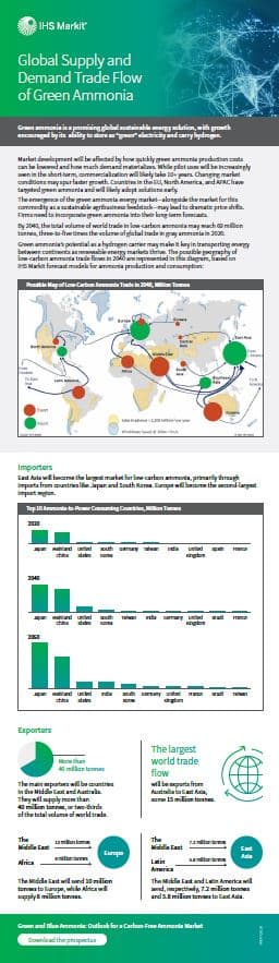 Green ammonia's potential as a hydrogen carrier may make it key in transporting energy between continents as renewable energy markets thrive. The possible geography of low-carbon ammonia trade flows in 2040 are represented in this infographic, based on IHS Markit forecast models for ammonia production and consumption.