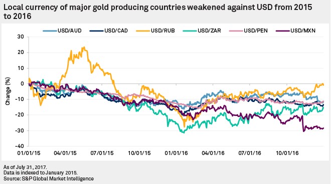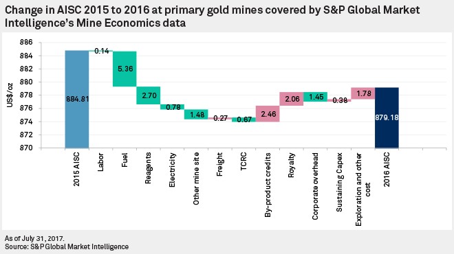 The average all-in sustaining cost, or AISC, in 2016 for primary gold mines covered by S&P Global Market Intelligence's Mine Economics data remained relatively flat from 2015. This was attributable to a drop in fuel, reagents and corporate overhead costs, partially offset by a fall in byproduct credits, increased royalties, and a rise in exploration and other costs. For 2017 as a whole, we expect AISC to again remain flat compared with 2016 due to strengthening local currencies in several major gold producing countries and escalating diesel prices, offset by increased byproduct credits, increased gold production volumes, and by some reductions in capital expenditure and corporate overhead costs.