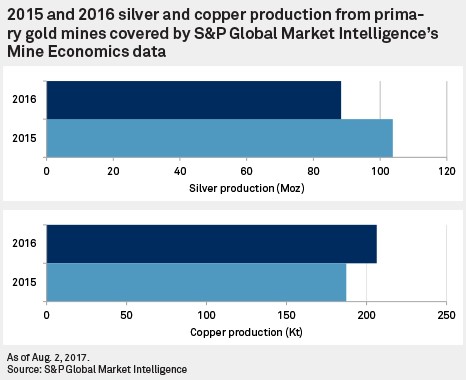 Byproduct credits as a group fell by 4% year-over- year on the back of reduced silver production and declining copper prices. The average silver price increased by 9% year-over-year. This was not, however, enough to offset the decline in silver production volumes from primary gold mines due to a fall in silver grades in processed ores. Such was the case for silver-rich assets like Penasquito, El Penon, and San Dimas. 2016 average silver grades at mines covered by S&P Global Market Intelligence's Mine Economics data fell to 3.9 g/t versus 4.7 g/t in 2015. Conversely, copper production volumes increased by 10% year-over-year, with notable rises from Cadia East, Buzwagi, and Mount Carlton. However, average copper prices fell by 12% year-over-year, offsetting the rise in metal output.