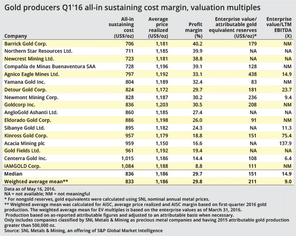The top 17 publicly listed gold companies that reported AISC produced gold at a weighted-average cost of US$833 per ounce in the first quarter, according to data from SNL Metals & Mining, an offering of S&P Global Market Intelligence.