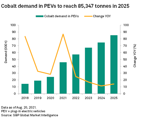 We expect continued relevance of cobalt in PEV battery chemistries in the foreseeable future and forecast global cobalt demand in PEV batteries to increase from 24,520 tonnes in 2020 to 45,857 tonnes in 2021 and 85,347 tonnes in 2025. Our recent scenario analysis, however, suggests that future cobalt demand could be drastically lowered by the higher uptake of low- or no-cobalt batteries.