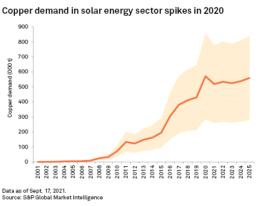 Copper is mainly used for electrical purposes in green technologies. In solar PV panels, copper is used in wiring, cabling, earthing, inverters, transformers and ribbons. As the copper intensity in solar PV panels depends on their size and model, demand could vary from 280,000 tonnes to 840,000 tonnes in 2025. We project global copper demand in solar PV panels in 2025 of 560,000 tonnes, which is very similar to 2020 demand when net additions to global solar capacity reached a record high. Given our base-case scenario of a tight copper market balance, however, the wide demand variation could have a significant impact on copper prices.
