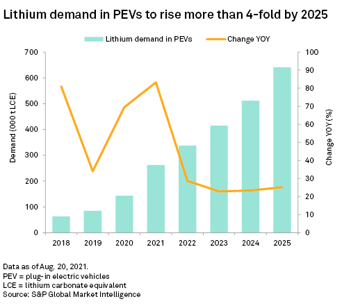 Lithium-ion batteries are used in electronic products and as rechargeable batteries in PEVs. These batteries are expected to remain the dominant battery technology for PEVs, at least to 2025, given the sharp reduction in its production cost over the past couple of decades. We forecast global lithium demand in PEV batteries to increase from 143,222 tonnes of LCE in 2020 to an estimated 262,343 tonnes and 640,517 tonnes of LCE in 2021 and 2025, respectively.
