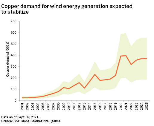 Copper intensity in wind turbines varies with the technology, which can impact copper demand conditional on the evolution of market share. While direct-drive turbines require on average 30%-90% more copper than gearbox models, they are most commonly deployed in offshore wind generation, which is projected to increase to 18% of the net installed wind capacity in 2025 from an estimated share of 8% in 2021, according to S&P Global Platts. We forecast global copper demand in wind generation to reach 370,000 tonnes in 2025, lower than the estimated 393,000 tonnes in 2020. This is driven through net additions in onshore wind energy having surged in 2020 and which are expected to average 27% lower annually over the 2021-25 period. In a high-copper-intensity wind generation scenario, copper demand reaches 553,000 tonnes, while deployment of low-copper-intensity technologies result in 184,000 tonnes of copper demand in 2025.