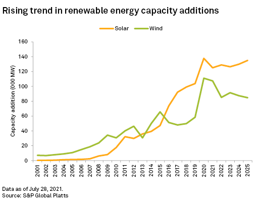 The most prominent technologies related to renewable energy generation are solar photovoltaic, or PV, panels and wind turbines. Installed capacity of solar and wind energy worldwide increased 19% annually from 2016 to 2020, according to S&P Global Platts, spurred by government incentives and improved cost competitiveness. Data from the International Energy Agency, or IEA, shows that installation of solar PV panels is consistently cheaper than building new coal- or gas-fired power plants in most countries. While the COVID-19 pandemic is estimated to have reduced global energy demand by 4%-5% in 2020, data from S&P Global Platts indicates that solar and wind energy saw a record 249 GW of net installed capacity additions as policy deadlines sped up the pace of investment in renewable energy. Net additions to global solar capacity were up by one-third while wind capacity almost doubled year over year in 2020, dominated by Chinese growth. Forecast net capacity installations for solar and wind combined are estimated at 217 GW annually over 2021-25, according to S&P Global Platts.
