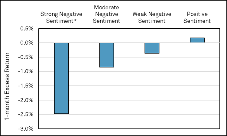 This study finds that the relative size of the price impact following a downgrade is dependent on the magnitude of the tone and the topics of focus in the report (Figure 1). Downgrades with strong negative sentiment underperform downgrades with positive sentiment by 2.7% over the following month.