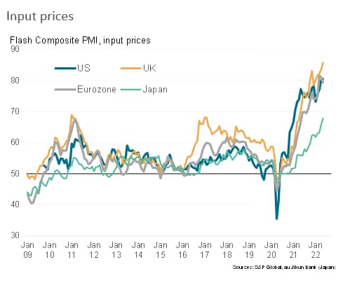 A further common factor dampening growth across manufacturing and services in all economies was the rising cost of living, with purchasing power having been dented across the globe by unprecedented price rises in recent months. The May surveys showed companies' costs increasing at historically elevated rates, with new record rates of inflation seen in the UK and Japan, albeit with the latter running behind all other G4 economies. Rates of increase eased in the eurozone and US, but merely from record highs in recent prior months.