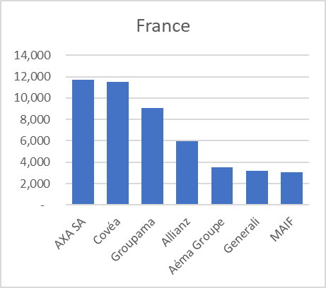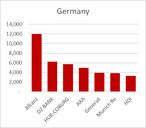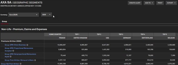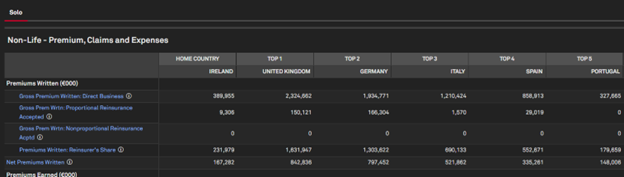 You can see in total there are six countries recorded. It is also worth noting that this is ‘Group’ data. Companies can report either as a ‘Solo’ entity or at a ‘Group’ level, or sometimes both. Group data should ideally reflect the ultimate parent’s features, though there could be variations in reporting. The data above – SFCR Group at the ultimate parent level (e.g., Axa Group) –looks highly reliable. It can become more complex with companies where the ultimate parent does not report SFCR data. Often, these are companies based in the US or Switzerland.