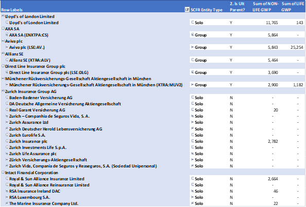 The results are grouped by the ultimate parent company, and the data ranked by the sum of the Non-Life Gross Written Premiums (GWP), a measure of insurance revenue for that group. In the majority of cases, you can see the model simply takes the Group data from the ultimate parent, which is the most reliable analysis. It should be noted that Lloyds of London publishes only Solo data. This is not clear from the SFCR report itself, but the excerpt below suggests it is the right data (as well as the size of the numbers).