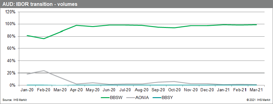 Australia is taking a multiple rate approach. The reformed BBSW is expected to continue alongside AONIA. Activity in AONIA has been very subdued over the last 12 months.