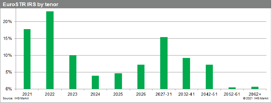 EuroSTR (a.k.a. €STR) will replace EONIA. There was an initial uptick at the end of July 2020 driven by the CCPs switching from EONIA to EuroSTR discounting on 25th July 2020. Since then, EuroSTR has made very gradual further progress but still only makes up 2% of volume traded. It is expected that EURIBOR will continue to be published until at least 2025 but that there will be a material migration to EuroSTR. EUR-LIBOR will cease publication on December 31, 2021 but EUR-LIBOR is not traded in the swaps market, there have been <10 trades a month for many years and therefore although it is included in the numbers it is excluded from these graphs.