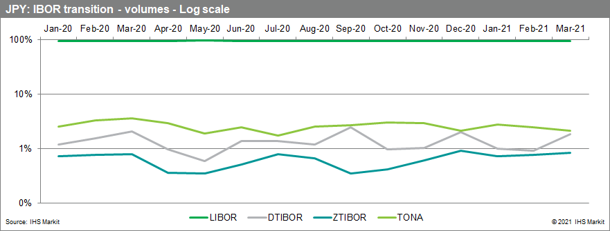 Japan is taking a multiple rate approach. DTIBOR is expected to continue alongside TONA. ZTIBOR is planned to be discontinued 2 years after LIBOR cessation. There has been little change over the last 15 months. JPY-LIBOR will cease publication on December 31, 2021 but LIBOR remains >95% of all JPY swaps volumes with TONA, DTIBOR and ZTIBOR making up approximately 2%, 2% and 1% of traded volumes respectively.