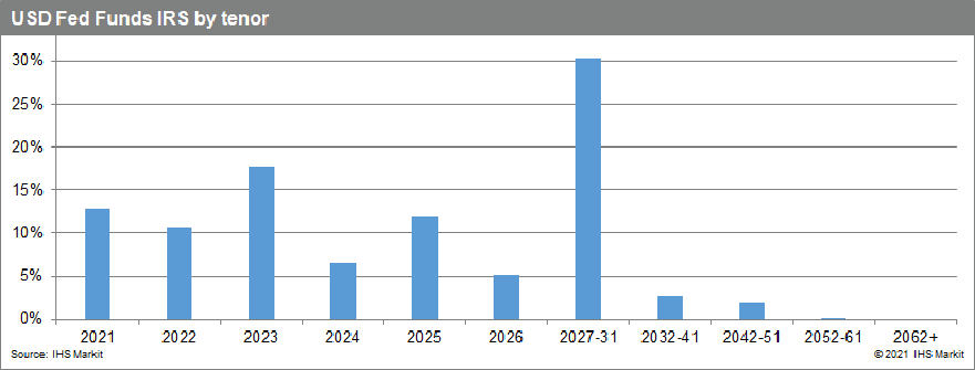 SOFR will replace Fed Funds and USD-LIBOR. There was an initial uptick at the end of October 2020 driven by the CCPs switching from Fed Funds to SOFR discounting on 16th October 2020. Since then, SOFR has made very gradual further progress but still only makes up less than 2% of volume traded. Unlike the other LIBORs it is expected USD-LIBOR will continue to be published until June 30, 2023.