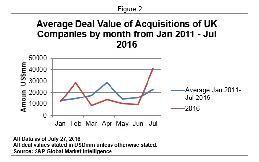 However, as the Figure 2 demonstrates, the deal values have been predominantly below average, with March 2016 being 50% of the average ($8.7B vs $17.5B), April being only 47% of the average ($13.59B vs $28.9B). July however shows a massive 177% gain ($40.6B vs $23B) although this was helped by Softbank’s acquisition of ARM holdings for $23.6 billion.