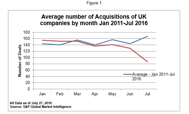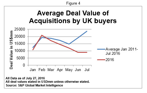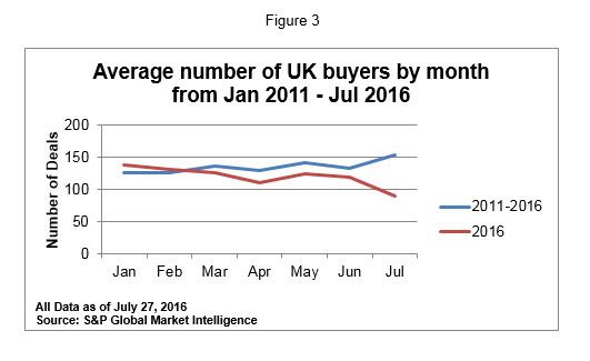Now, let’s take a look at UK companies making acquisitions. Figure 3 below has a similar shape to what we saw in the very first chart. We see that up until June things were pretty much following the average but in July those numbers dropped significantly to 90 deals from an average of 153.