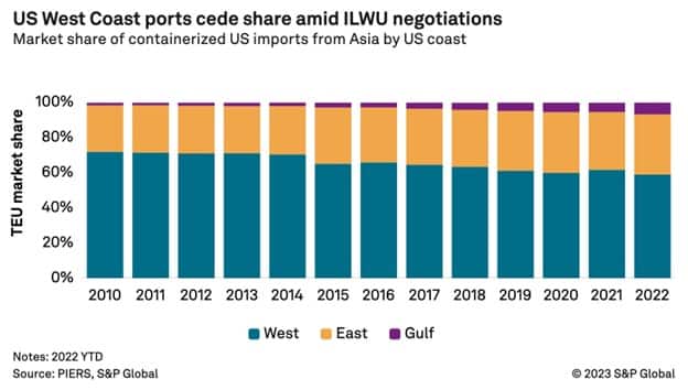 West Coast ports have been bleeding cargo since last September. The West Coast share of U.S. imports from Asia by year's end was 58.8 percent, down from 61.5 percent in 2021, according to PIERS, a Journal of Commerce sister product within S&P Global. The East Coast's share increased to 34.2 percent from 32.8 percent in 2021, while the Gulf Coast's share of Asian imports last year was 6.6 percent, up from 5.3 percent.