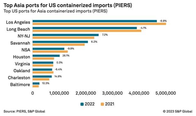 At the individual port level, U.S. imports from Asia last year declined 6.9 percent in Los Angeles, 4.1 percent in Long Beach, 9.9 percent at the Northwest Seaport Alliance of Seattle and Tacoma, and 6.4 percent in Oakland from 2021, according to PIERS. Meanwhile, Asian imports increased 7.2 percent in New York-New Jersey, 6.2 percent in Savannah, and 26.1 percent in Houston.