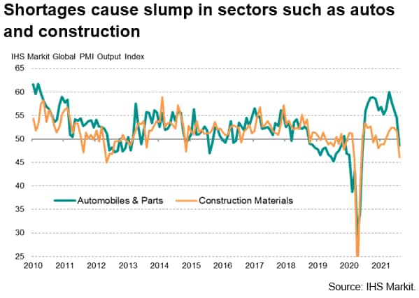 Steep slowdowns were also seen in many manufacturing sectors, most notably automotive production and construction materials, linked in many cases to supply shortages curbing production capacity.