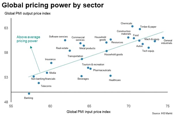 With August seeing a rise in COVID-19 case numbers globally due to the spread of the Delta variant, it was no surprise to see healthcare lead the Purchasing Managers' IndexTM (PMITM) growth rankings and hospitality slump. Similarly, growing pandemic related shortages have increasingly hit many manufacturing sectors, such as automotive and construction materials, with spill-overs to some service sectors such as IT services. Price pressures are most concentrated in those sectors reporting the greatest constraints.