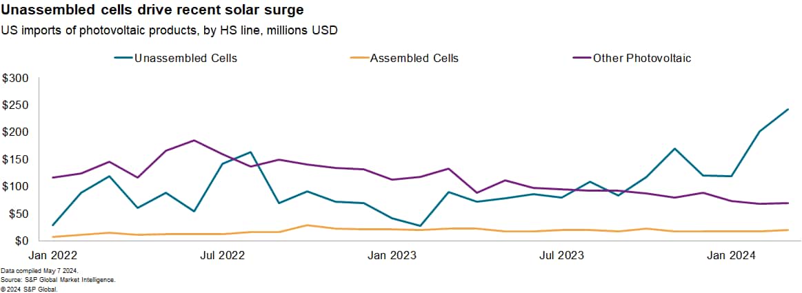 The growth of unassembled modules may indicate that assembly is growing in the US — this may allow companies to adapt to tariffs if unassembled modules from different countries are substitutable.