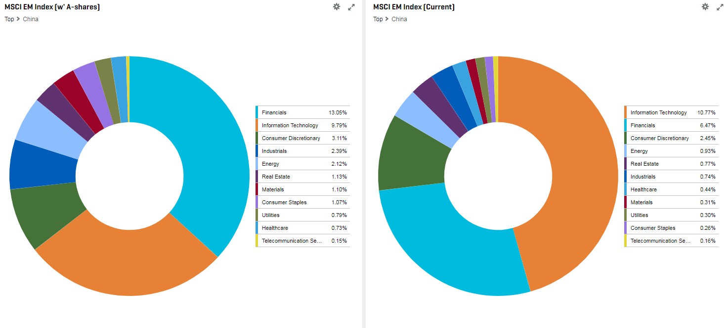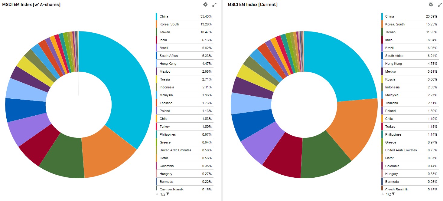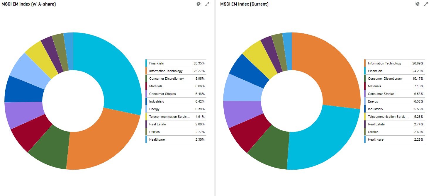 By utilizing our portfolio analytics and reporting tools, we are able to observe that China has indeed lifted its weight to 35.4% from its previous 23.6% from the MSCI EM Index. Including Hong Kong, its Greater China contribution comes to approximately 40% after the full inclusion. Similarly, South Korea now contributes to 13.3% vs. a prior 15.3%, where Taiwan and India continue to hold their third and fourth places contributing 10.5% and 6.1% weights in the EM Index, respectively.