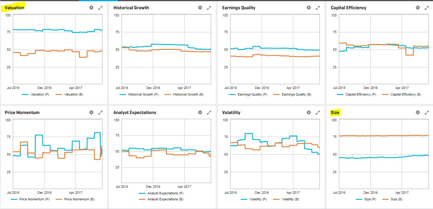 We first ran a style comparison analysis using our proprietary Alpha Factor Library (AFL) styles of that index vs. the MSCI China H-share for the most recent one-year time period and noticed that the biggest and persistent discrepancies occurred in styles valuation and size: