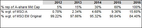 Based on the recent announcement by MSCI(1) on China A-shares inclusion into the MSCI Emerging Market (EM) Index, we first conducted a simulation analysis where we assumed that the 222 proposed A-share names were gradually included into the MSCI EM Index for the past five years, at the pace of 5%/ 15% / 30%/ 60%/ 100% from year 2012 to 2016.