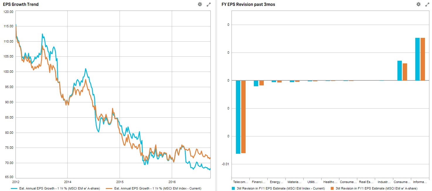 By comparing the new MSCI EM Index with A-shares inclusion to the current EM Index, the new index has a higher valuation in terms of P/E at times, particularly starting the end of 2016, when the A-share market was anticipating another wave of market liberalization. Looking ahead, forward multiples e.g., EV/EBITDA for the next three financial years are quite in-line for the new EM index vs. the pre-A inclusion.