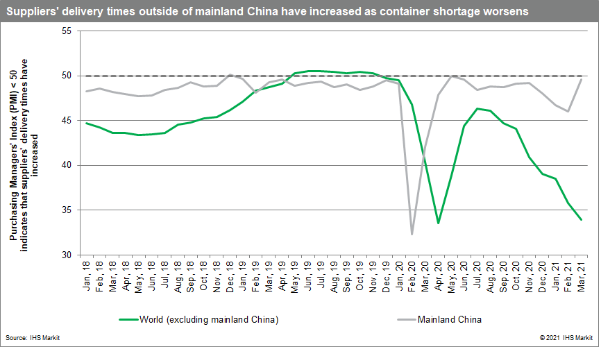 Supplier delays outside mainland China deteriorated far more than within China. With strong domestic demand and exports constrained by the scarcity of containers, Chinese manufacturers have prioritized deliveries to their domestic markets, in line with Chinese government policy priorities.