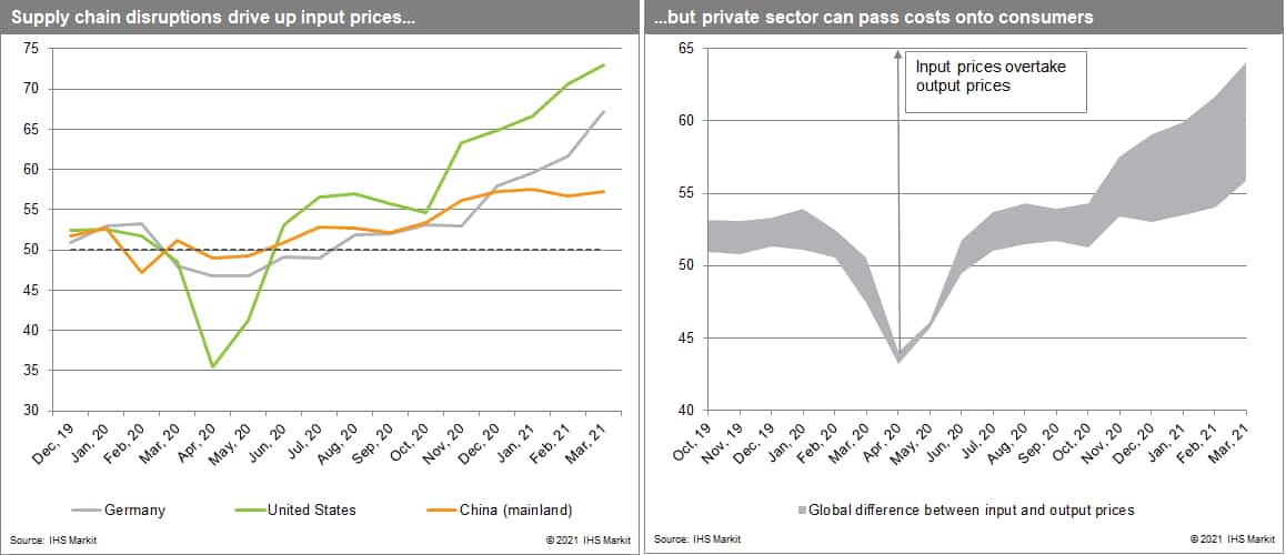 Supplier delays are translating into higher input prices too. IHS Markit's Global Purchasing Managers' Index (PMI) shows that in March 2021 average input prices rose by the most that they have in 12.5 years. They have not yet been fully passed through to clients: increases in output prices have been smaller, even if selling prices rose for the ninth consecutive month and at the fastest rate since these data were first collected in October 2009. The pass-through to output prices were higher in the US than in the Eurozone, where manufacturers, in particular, have so far absorbed some of the rises in input costs. And again, this spread reflecting supply chain pressures is narrower in mainland China.
